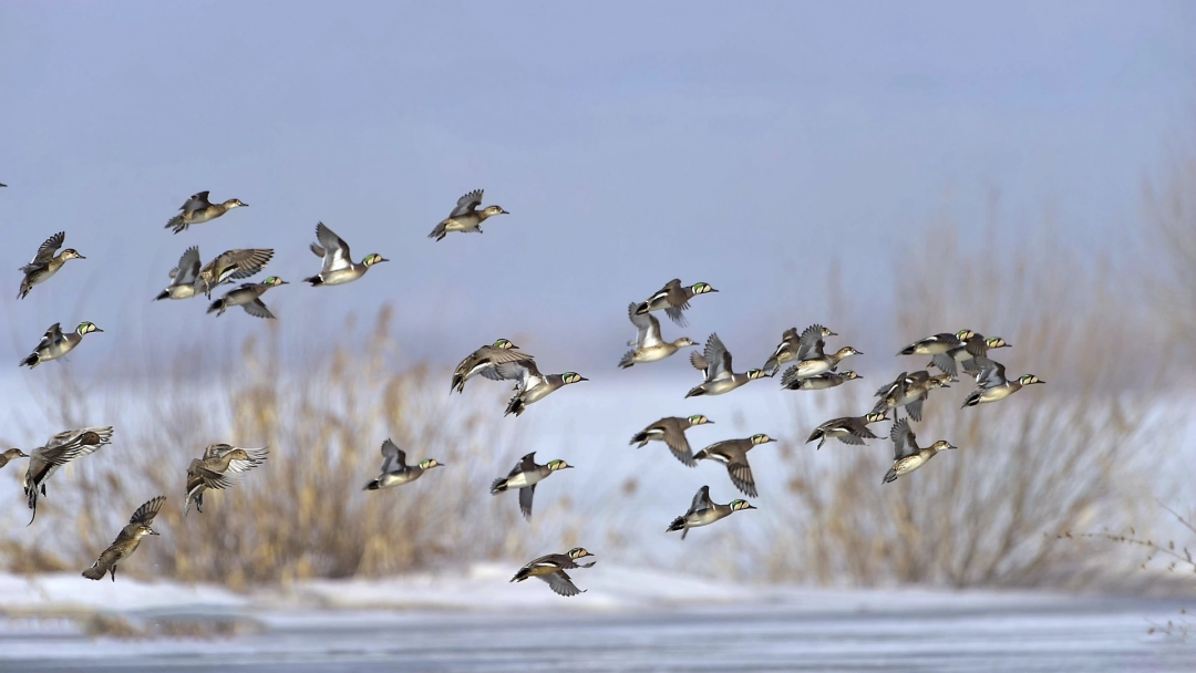 “北冥有鱼”奇观的核心在于花脸鸭高度社会化的习性:它们冬季在长江中下游等湿地集结成数万甚至数十万只的超大群体,通过密集队形共同防御天敌、提高觅食效率。当受到外界惊扰或集体转移觅食地时,鸟群会瞬间同步起飞,在空中形成如巨鲸游弋般的流动形态。这种令人震撼的“鸟浪”,充分展现了物种生存的智慧。