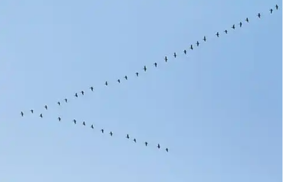 花脸鸭的聚集起飞迁徙与大雁族群有相似之处,都体现了水禽的迁徙本能和集群优势,但也存在显著不同。大雁以其经典的“人字形”或“一字形”队列迁徙而闻名,这种队形能够最大程度地利用空气动力学原理,减少每只大雁的能量消耗,形成高效的接力式飞行。它们通常由经验丰富的老雁带头,轮流担任领队。