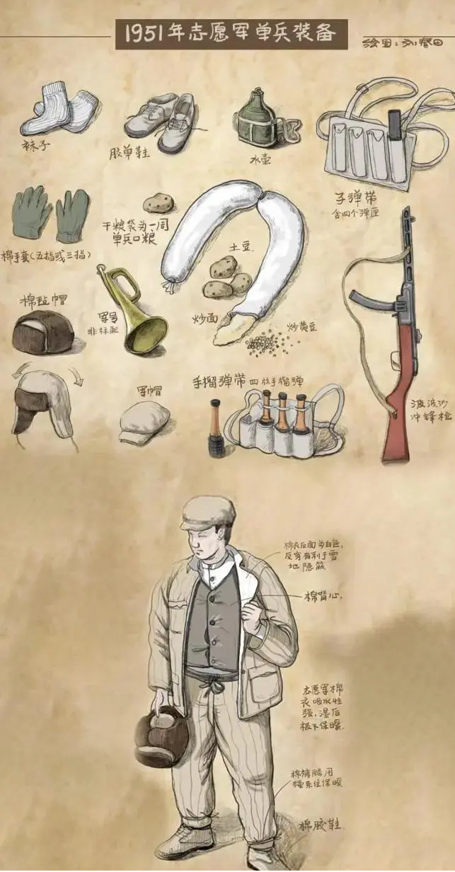 1950年11月的新兴里战场,零下40度的极寒中,美军士兵裹着防水羽绒睡袋酣眠;而相隔不过数里的志愿军阵地上,战士们正用体温融化冻硬如石块的土豆。志愿军战士拼着超人的钢铁意志顶着恶劣冰雪环境与美军周旋的过程中,呈现了太多太多感人至深的画面:二十军八十九师作为第一批入朝参战的队伍从上海出发,途径沈阳停留时战士们还穿着单衣,凭借着拆解棉被里的棉花缝到容易冻伤的身体部位的衣服处来抵御严寒;师政委王直违反规定下令剪碎在战斗后缴获的3000条羊毛毯分给全军——每条毛毯化为数百块碎布,堪堪裹住战士冻僵的手脚......而这一条遗留至今的羽绒睡袋,或许也曾在从美军手中被缴获后,轮流分享着温暖过很多志愿军战士。这种极端特殊情形下"聚沙成塔"的后勤智慧,恰是革命意志熔铸的生存艺术最好的写照。