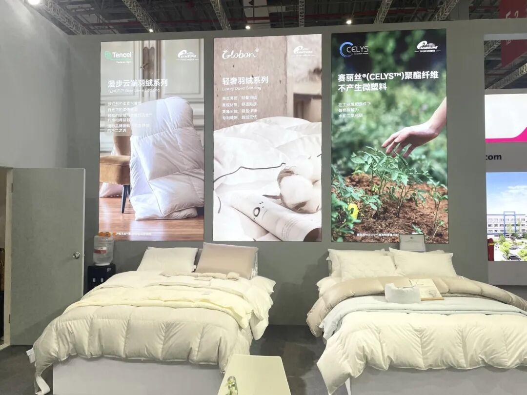 除了面辅料展,三星羽绒成品羽绒寝具和绍兴金诺服饰分别亮相国际家用纺织品博览会的5.2E68展位和国际服装服饰博览会的2.1L608展位。在家纺展现场,三星羽绒展示了其精心打造的羽绒寝具系列,作为世界羽绒行业的领军者,三星羽绒此次带来的羽绒寝具不仅秉承了其一贯的高品质标准,更融入了创新的设计理念,充分展现了三星羽绒在羽绒材料研发方面的卓越实力。