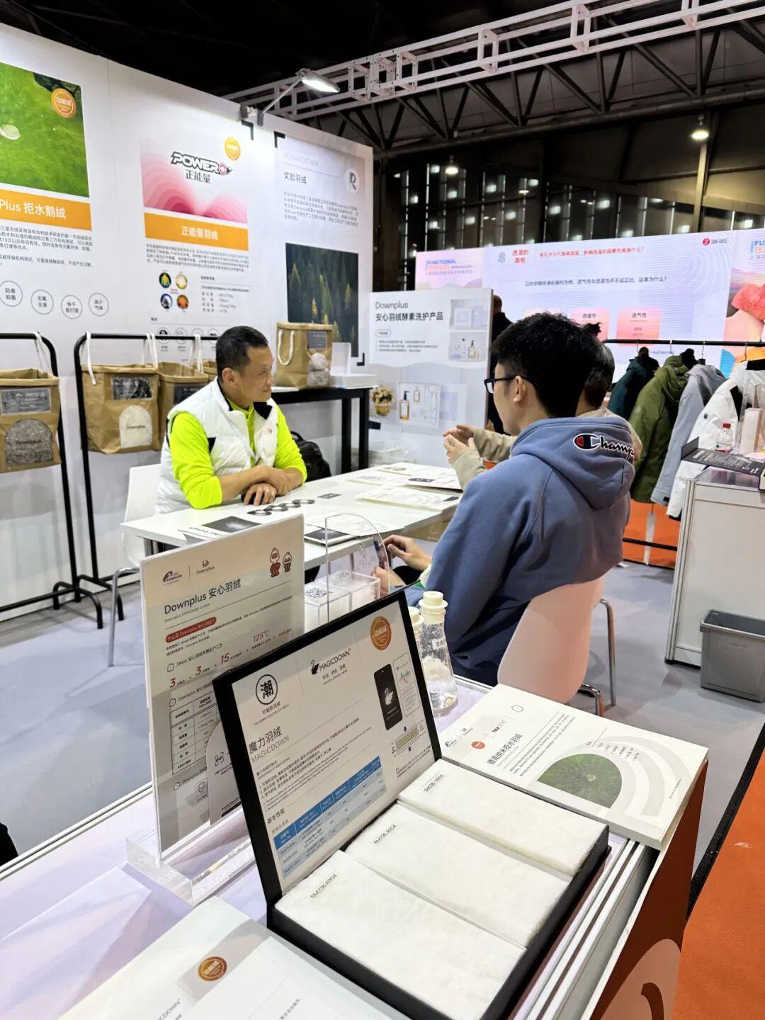 除了三个在上海国家会议中心的三大展会,在浦东世博展览馆的上海国际功能性纺织品展览会NO.J09展位也能看到Downplus安心羽绒的身影。比利牛斯木拉白鸭绒、波兰拉尼亚白鸭绒、青头灰鸭绒、正能量羽绒、CLEAN PLUS拒水2.0等新品依然是到访客户的关注重点。