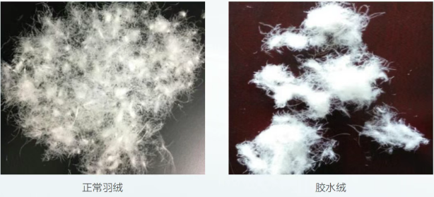 顾名思义,胶水绒是用化学粘合剂将羽丝、绒丝、鸡丝、杂质及粉尘和正常的朵绒粘合,以提高绒子含量,并造成高蓬松度的假象。杂质多导致气味大,飞丝多还导致跑毛严重,消费者的穿着体验感大大降低。胶水绒成本低,在市场上具有很强的竞争力,对不懂行的采购商具有较大的诱惑力。