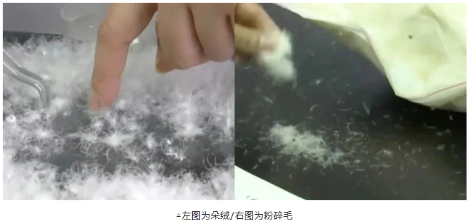 粉碎毛是市场中常见的一种假羽绒,粉碎毛是不法商家将不起保暖作用的鸭/鹅毛片经机械粉碎后筛选而成的碎毛,呈丝状和片状。由于粉碎毛无法像绒子一样固定空气,因此保暖性极差。