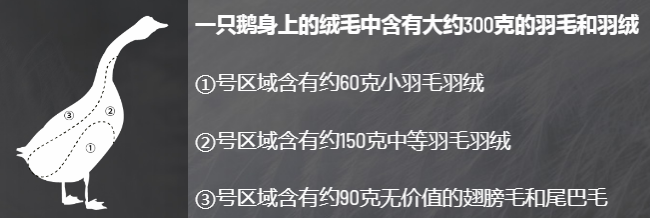 以普通白鹅为例,一只鹅全身的羽毛羽绒约重300克,但并不是这300克的羽毛羽绒全部都能用于制品的填充。加上运输、水洗过程中的损耗,最终在一只鹅身上可以获得平均约28克的羽绒,换算下来是鹅全身羽毛重量的10%。羽绒是食品加工行业的副产品,因此,羽绒原料供应的数量与鹅鸭养殖存栏数量密切相关。近年来由于一些特殊的原因,鹅鸭养殖总数量在逐年减少,优质原料供不应求,导致羽绒价格相对较高。而部分不法商贩为牟取暴利,抓住公众对羽绒知识知之甚少、优劣难辨的盲区,以次充好,以假乱真。