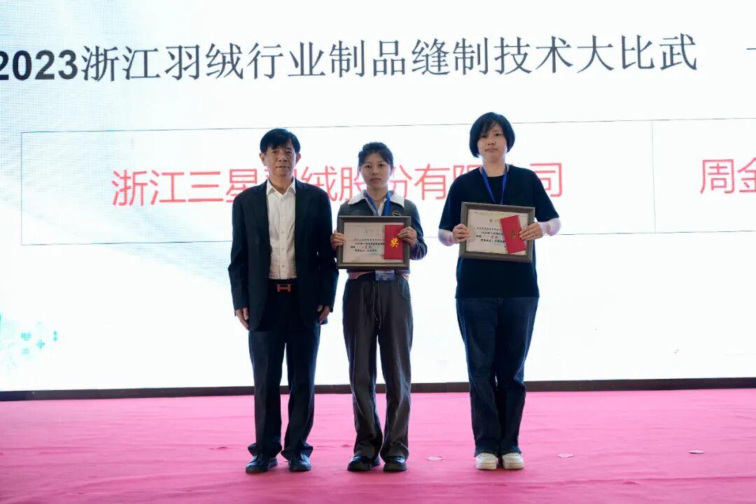 (三星羽绒周金霞上台领取“2023浙江羽绒行业制品缝制技术大比武一等奖”)