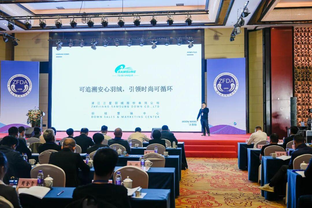 三星羽绒羽绒营销中心总监王孜怡作为“浙江羽绒行业2022年度突出贡献奖”获得者上台进行了《可追溯安心羽绒,引领时尚可循环》的主题分享。在碳中和的时代课题下,能源的循环再利用备受关注,奖励羽绒是一个三星羽绒独立开发的DOWN PLUS认证的可追溯再生羽绒计划,这是与品牌商合作,回收含有DOWN PLUS认证的旧羽绒制品,根据GRS标准和SFRESH专属生产工艺进行拆解,再加工后作为新产品填充料的环保可持续商业计划。这个项目可以减少能耗,减少污染,延长羽绒产品使用寿命,目前已经受到海外客户的高度认可,现场同样受到了很多同行的关注和肯定。