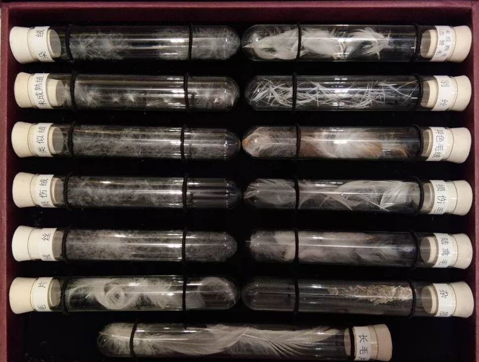 准确检测羽毛绒的成分是一个世界性难题,现行唯一可行的种类检验方法是对每朵(根)羽毛绒进行肉眼分析,目前还尚无化学的、机械的或其他检验方法。所以小样间的工作人员需要很好地区分与掌握羽毛绒成分分析中完整的水禽羽毛、水禽损伤毛、陆禽毛(含陆禽损伤毛和陆禽羽丝)、长毛片、大毛片、包含绒子/绒丝/羽丝的混合物、杂质等七大成分的形态特征,将其挑拣出来并分置不同的容器中,再称重计算相对的百分含量。