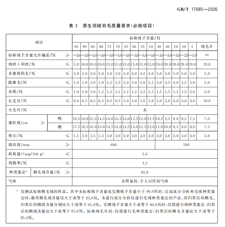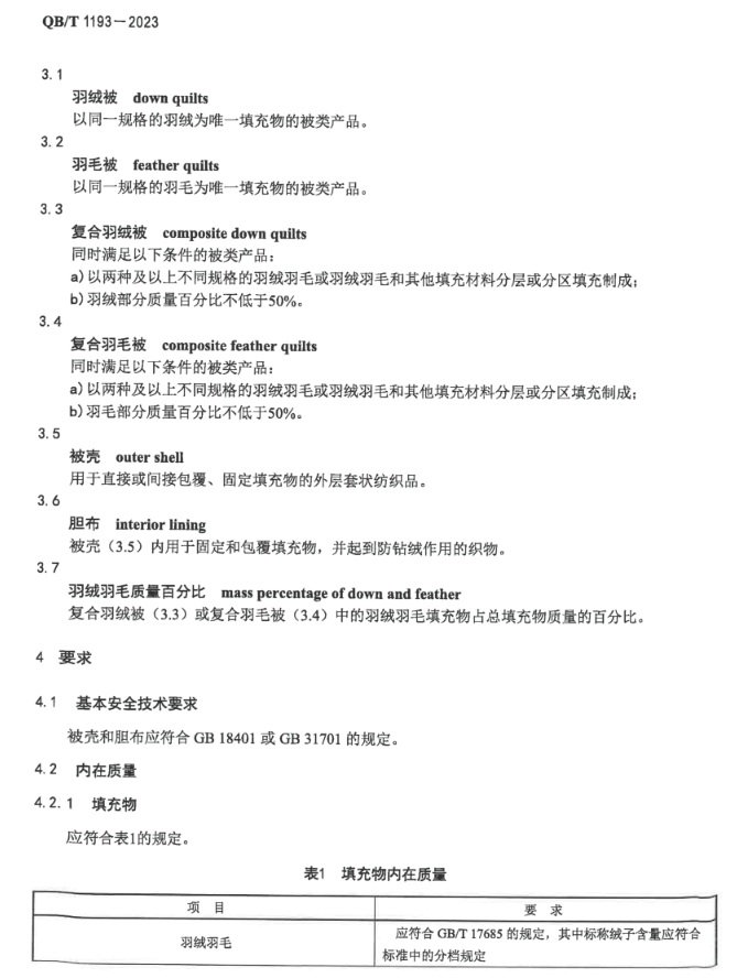 来源:QB/T 1193 - 2023《羽绒羽毛被》,GB/T 17685-2026《羽绒羽毛》