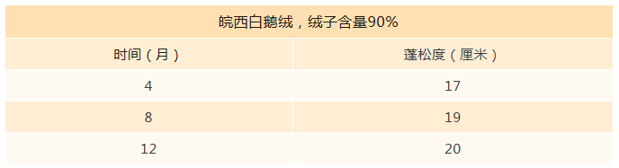 以皖西白鹅为例,其饲养周期为4个月时,所产90%绒子含量的羽绒蓬松度即达到17CM(约680in³/30g),8个月时可以达到19CM(750in³/30g),而12个月以上则能够高达20CM(800in³/30g)。