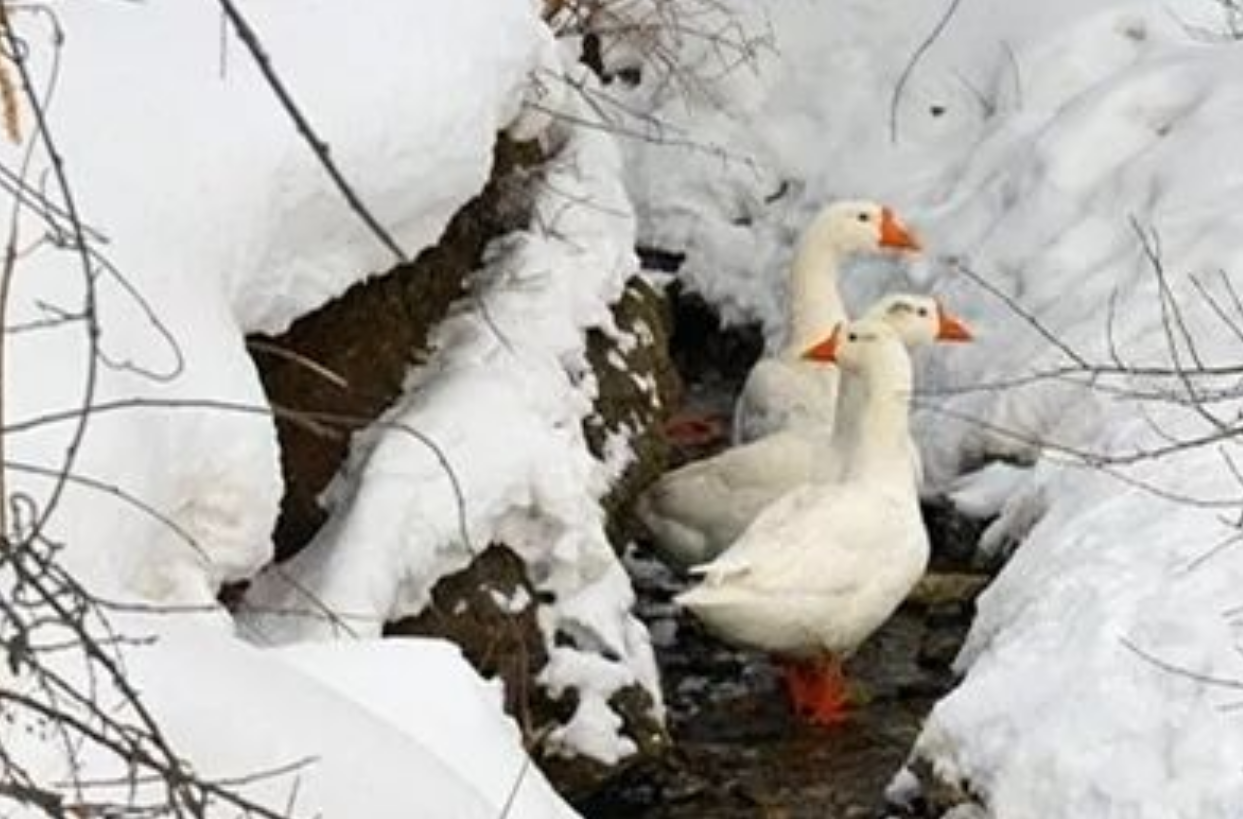 长白山脉延伸部分老岭山脉的深处——吉林省临江市花山镇松岭雪村,冬季寒冷多雪,天然散养的大白鹅们不失为松岭雪村一道美丽的风景线。
